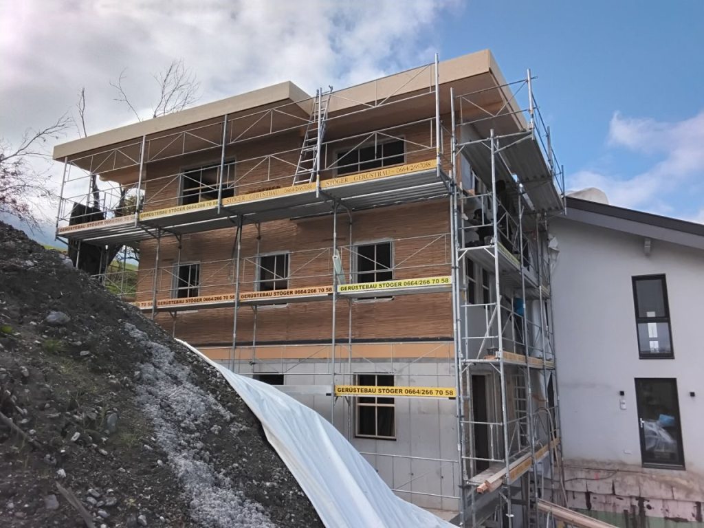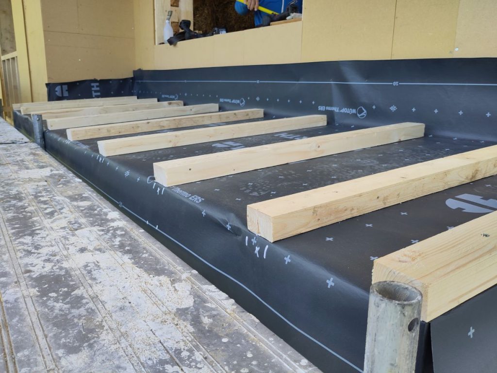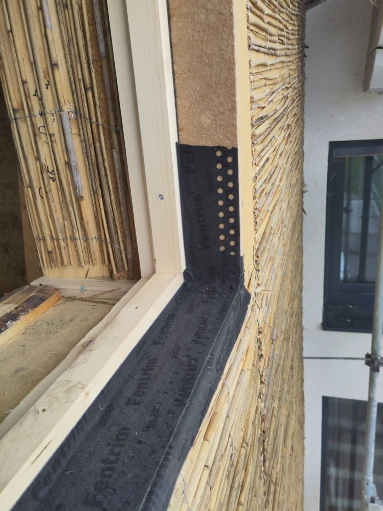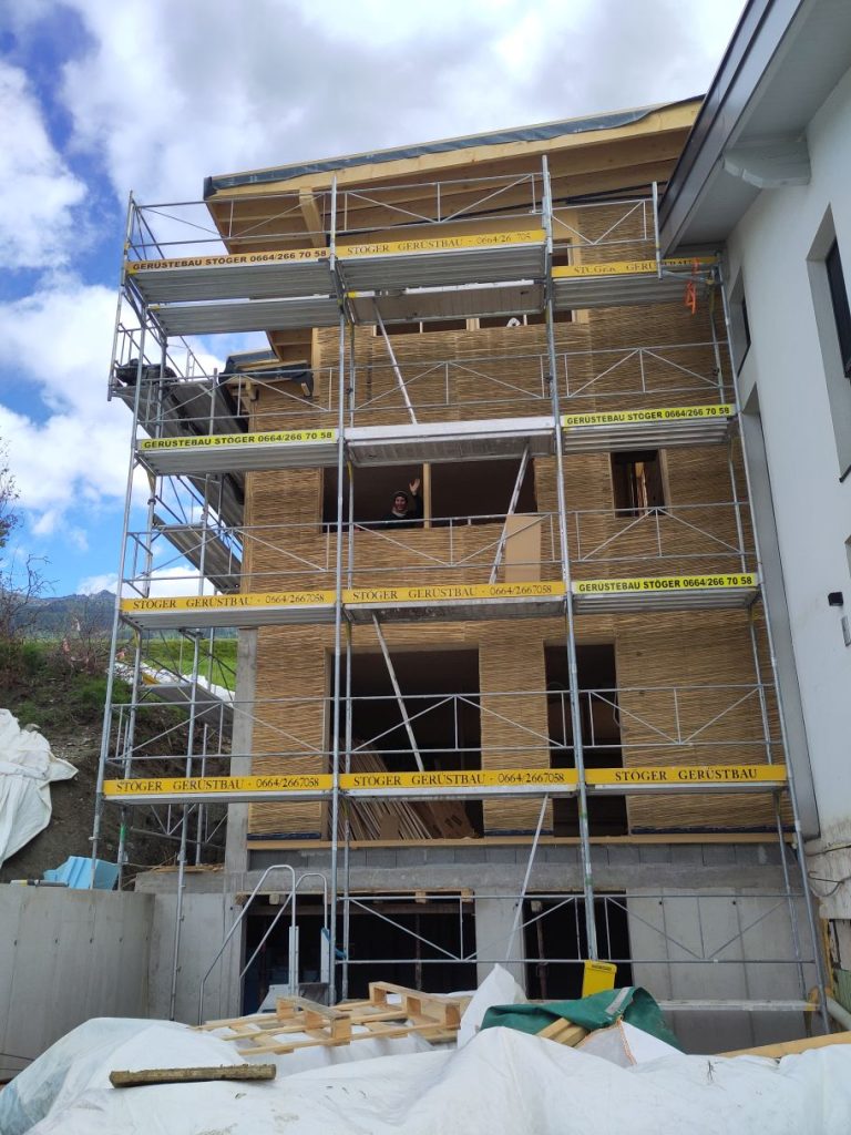 - Während der Montage sollte es nicht regnen (Starkregen), da die Module mit den exponierten Strohballen nur bedingt Regen vertragen (im Stehen mehr, im Liegen weniger). Es empfiehlt sich also, eine Seite (die Oberseite) regensicher auszuführen (DWD, DHF, Rauschalung mit Folie oder Kraftpapier)