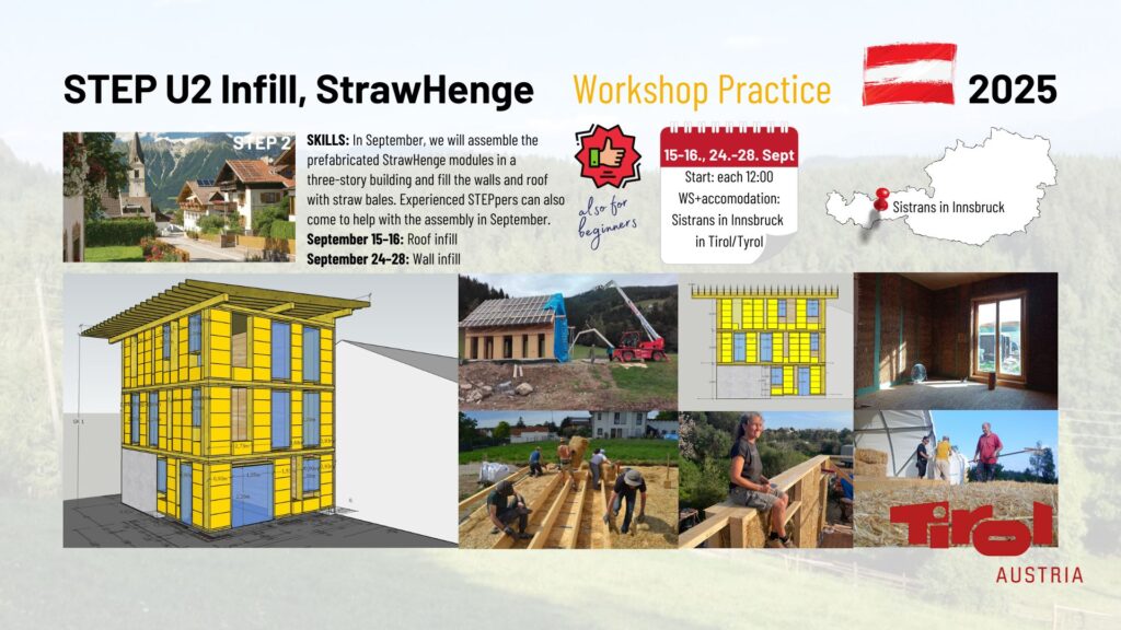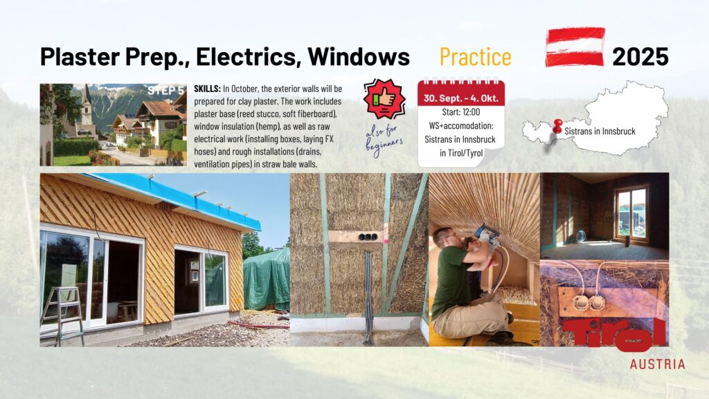 Location: Sistrans near Innsbruck in Tyrol, Austria (DE/EN), [INFO]. Straw bale infill workshop on site in roof and walls. Start: Wed 12:00, End: Su 17:00