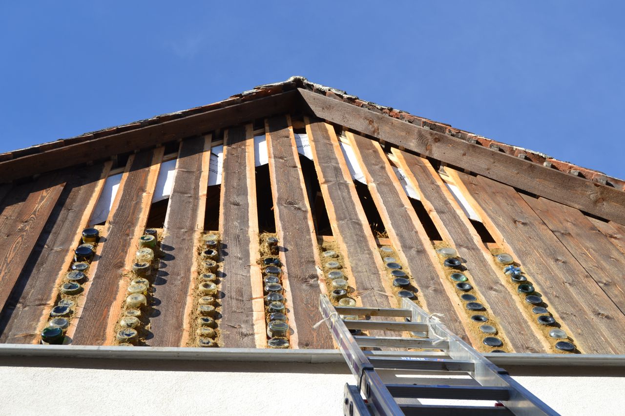 Doppelständerwand mit Stroh-Bodenplatte, Zwischendecke und Strohballen-Giebeldach