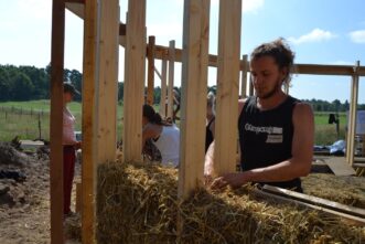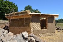 Die vorgefertigte Holzkonstruktion wird im Rahmen eines 14tägigen Workshops in Ecotopia (Schweden) in CUT-Technik mit Strohballen gefüllt und mit Lehm verputzt, das Oktogon dient als Stall für Schafe und Ziegen.