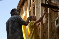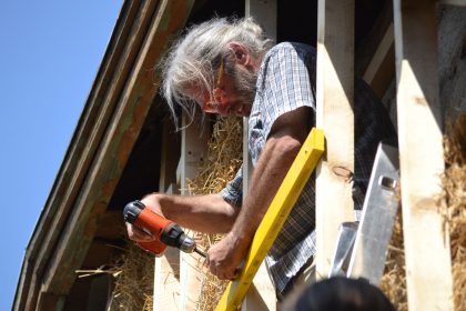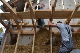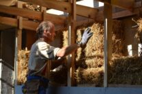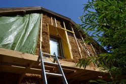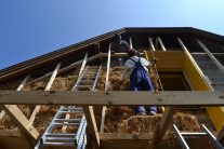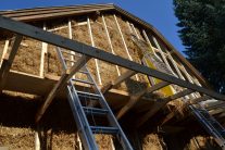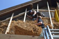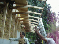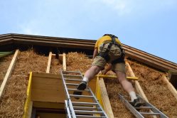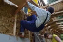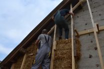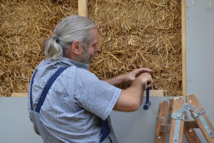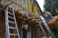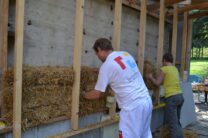 Thermische Sanierung einer 49 cm dicken Ziegelwand durch Anbringen einer vorgesetzten Strohfassade mit Hilfskonstruktion aus 5 x 8 cm Staffeln, die außen mit Fermacell HD Fassadenplatten beplankt wurden. Um die Strohballenwand vor Schmelzwasser (Schnee) und Spritzwasser zu schützen, wurden als Fundament mit Schaumglasschotter gefüllte Boxen errichtet. Das 94 Jahre alte Jugendstil-Haus in Matzen bei Neulengbach stellt derart eine Altbausanierung mit Passivhauskomponenten (≤ 35 kWh/m2a im Heizwärmebedarf) dar.
