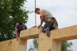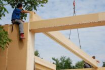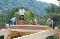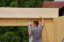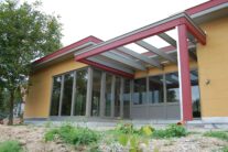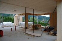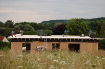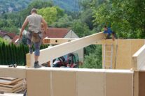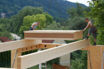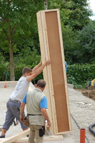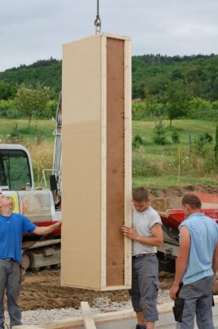 Nach rund zwei Jahren Entwicklungszeit in der Kooperation system/haus/bau (ASBN, Kreativer Holzbau, Bauatelier Schmelz), in der wir u.a. vorgefertigte Module entwickelten und eine ETZ – Europäisch Technische Zertifinzierung für Baustrohballen (mit Waldland, später in Lizenz von Sonnenklee weiter produziert) konnten wir 2010 das erste Prefab-system/haus in Schönberg am Kamp verwirklichen. Die Module bestehen aus Steico-Joist-Ständern mit fliegender Holzweichfaser-Feder (Nut-Feder-System zur einfacheren Montage), einer Innenbeplankung mit OSB-Platten und einer äußeren Agepan-Platte (diffusionsoffene MDF). Zur Erreichung des Passivhausstandards wird die Fassade zusätzlich außen mit Weichfaserplatten beplankt. Innen wurden Heraklith BM als Installationsebene und Lehmbauplatten mit Lehm-Feinputz verwendet.