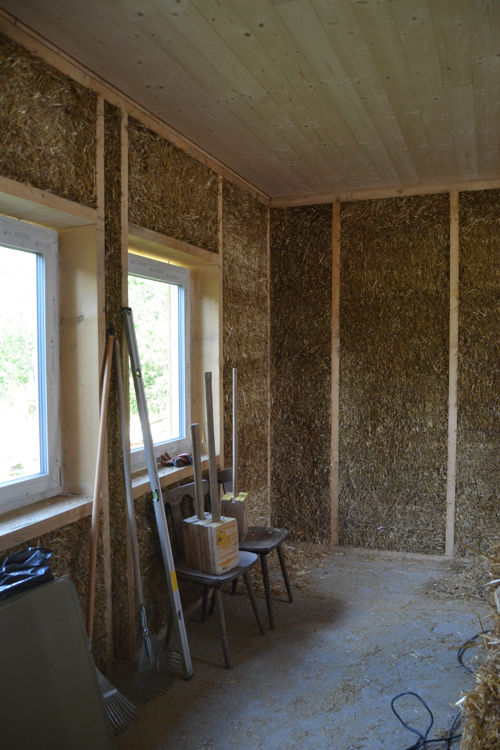 Doppelständerwand mit Stroh-Bodenplatte, Zwischendecke und Strohballen-Giebeldach
