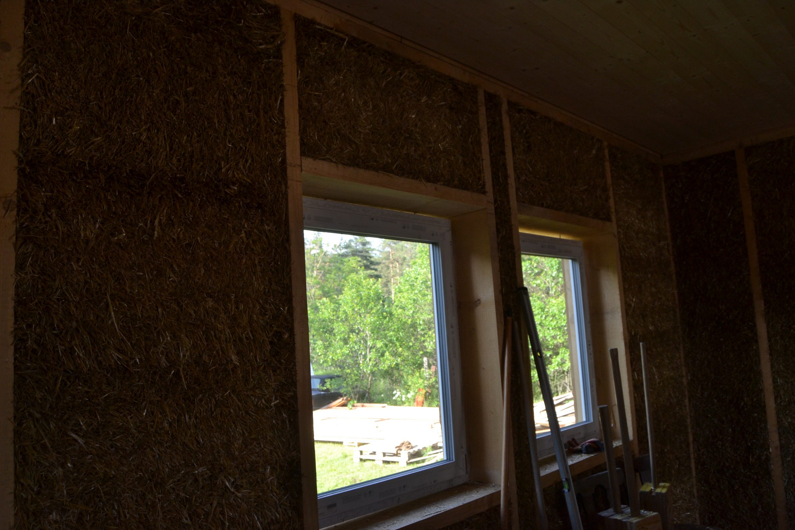 Doppelständerwand mit Stroh-Bodenplatte, Zwischendecke und Strohballen-Giebeldach