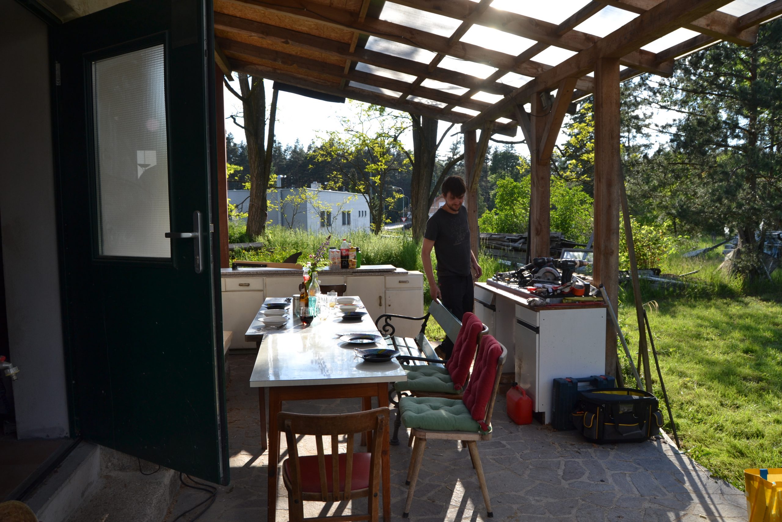 Doppelständerwand mit Stroh-Bodenplatte, Zwischendecke und Strohballen-Giebeldach