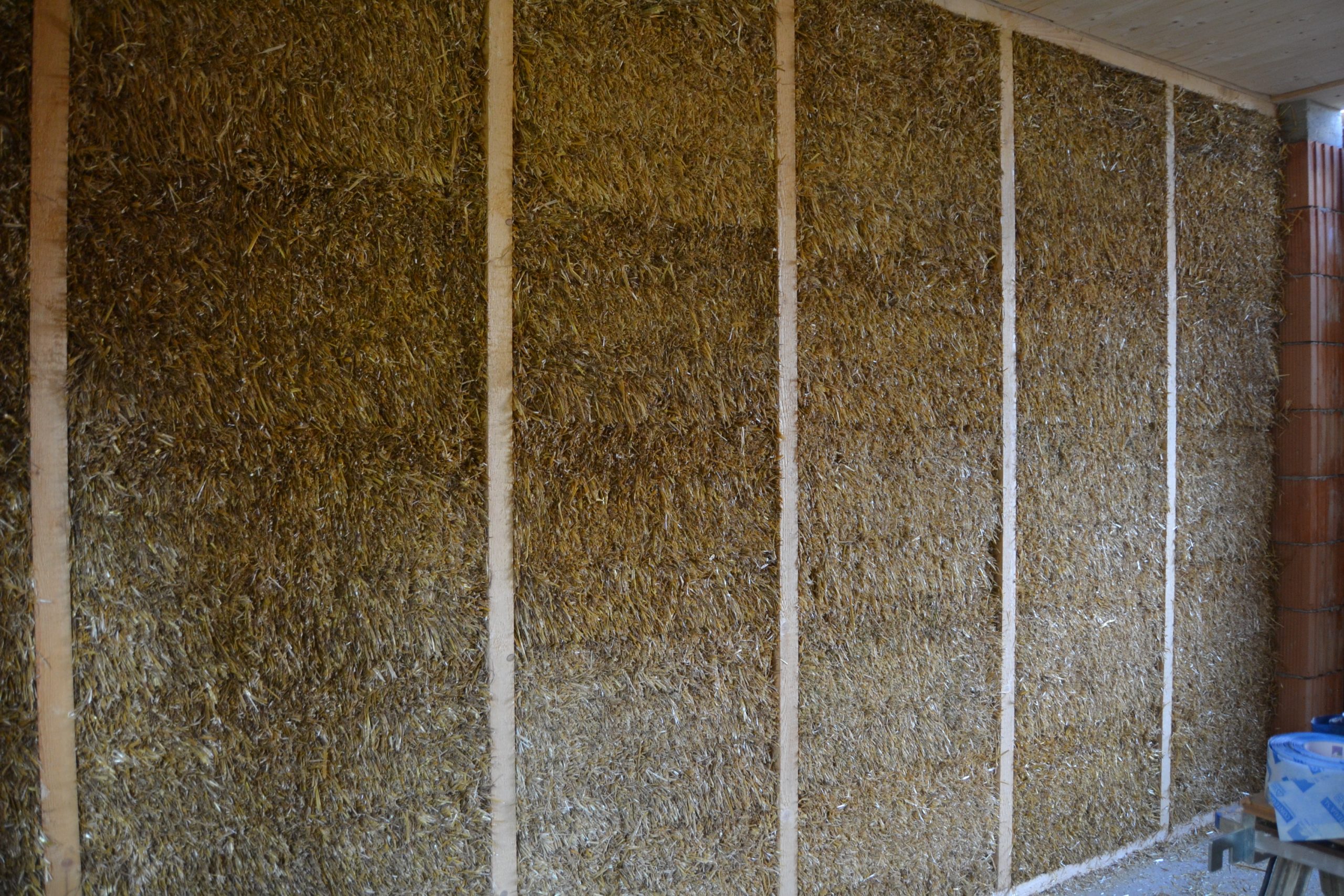 • Doppelständerwand mit Stroh-Bodenplatte, Zwischendecke und Strohballen-Giebeldach