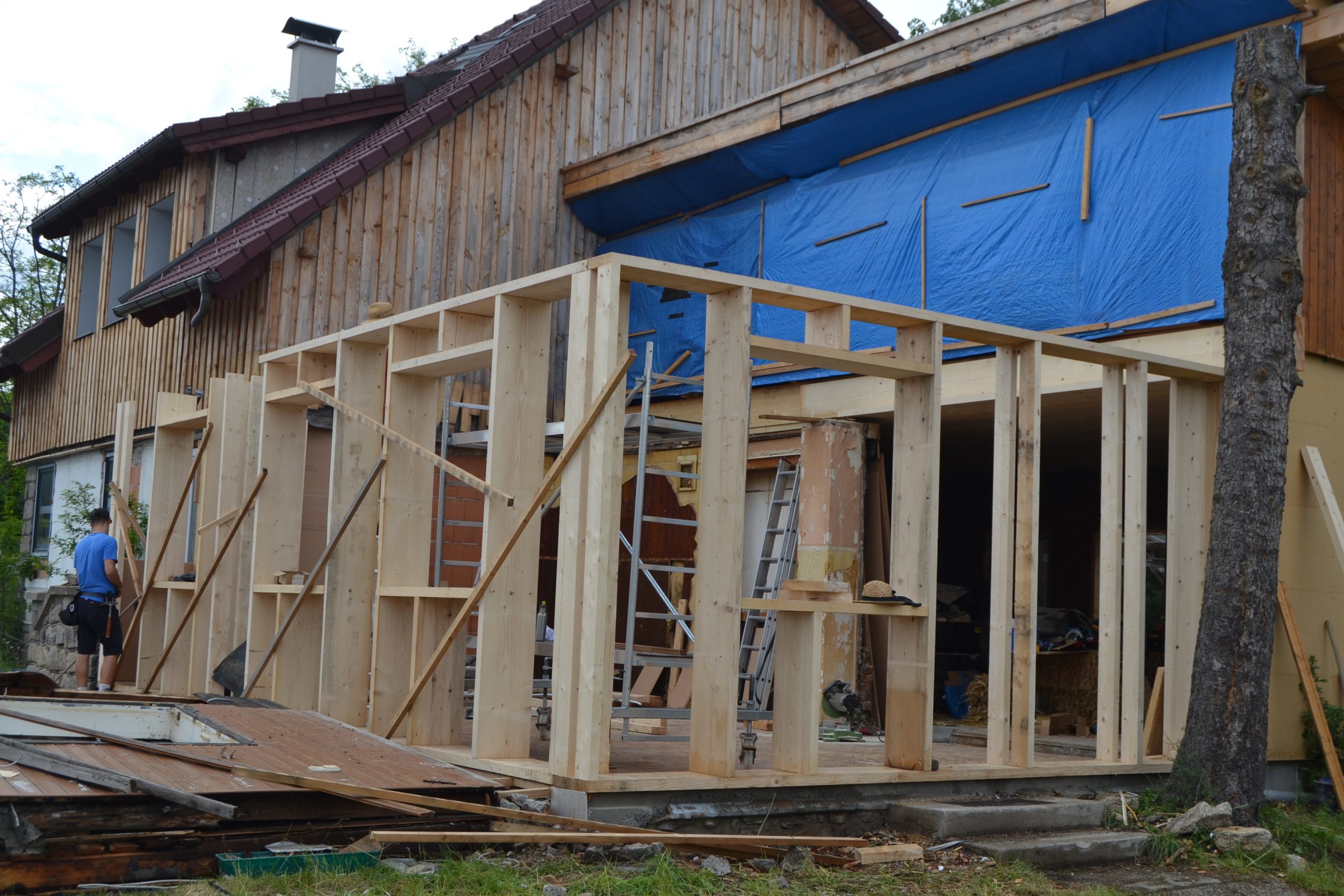 Doppelständerwand mit Stroh-Bodenplatte, Zwischendecke und Strohballen-Giebeldach