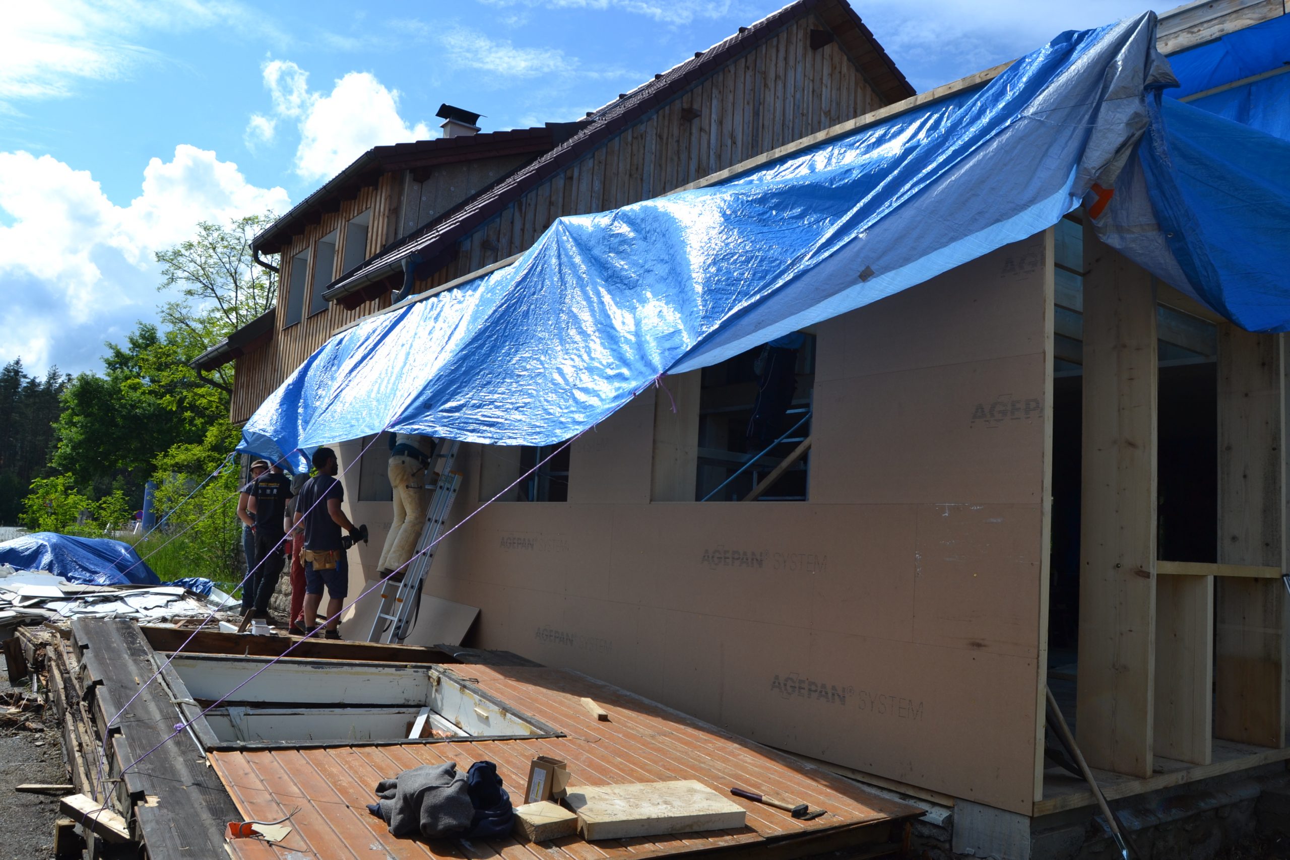 • Doppelständerwand mit Stroh-Bodenplatte, Zwischendecke und Strohballen-Giebeldach