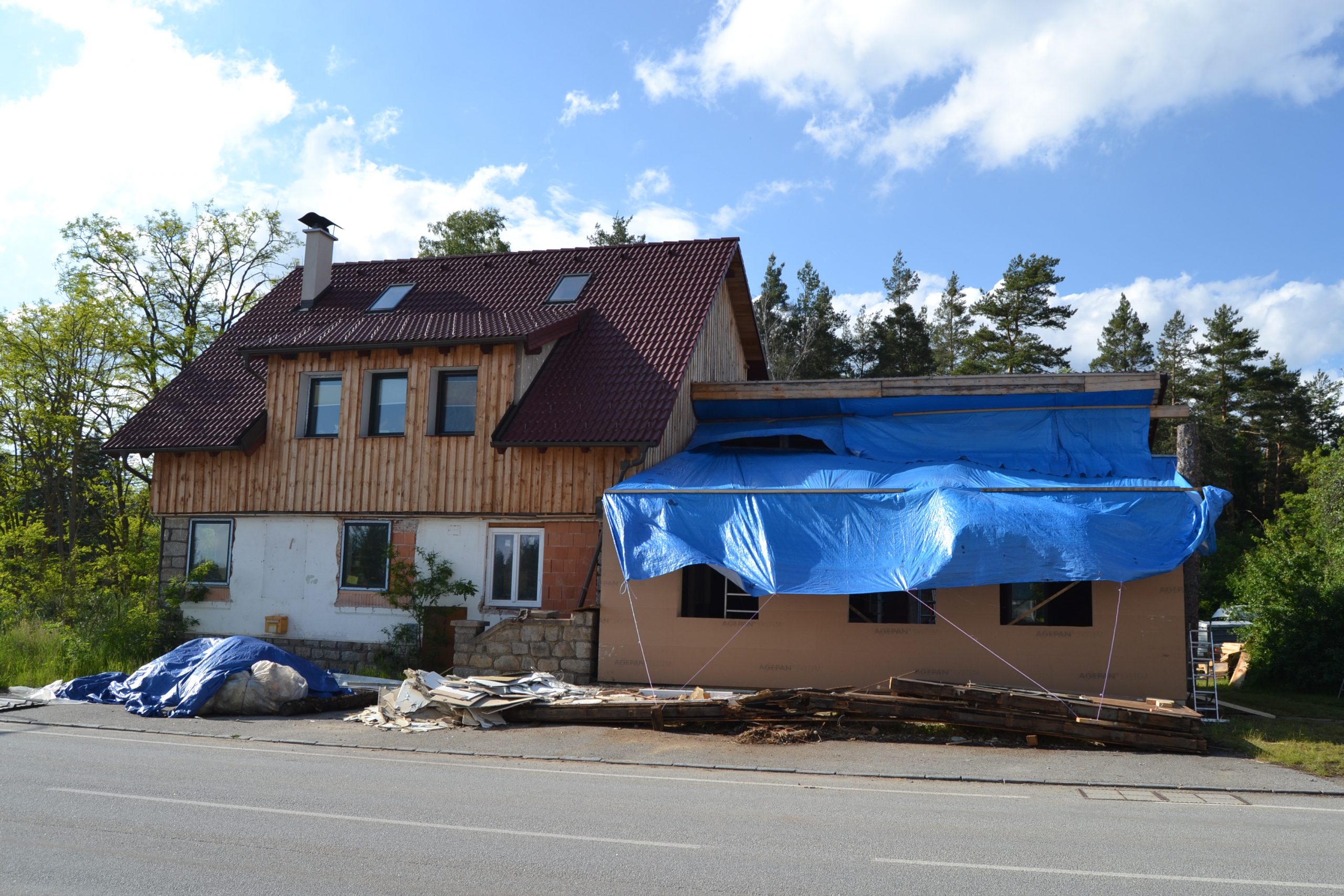 Doppelständerwand mit Stroh-Bodenplatte, Zwischendecke und Strohballen-Giebeldach