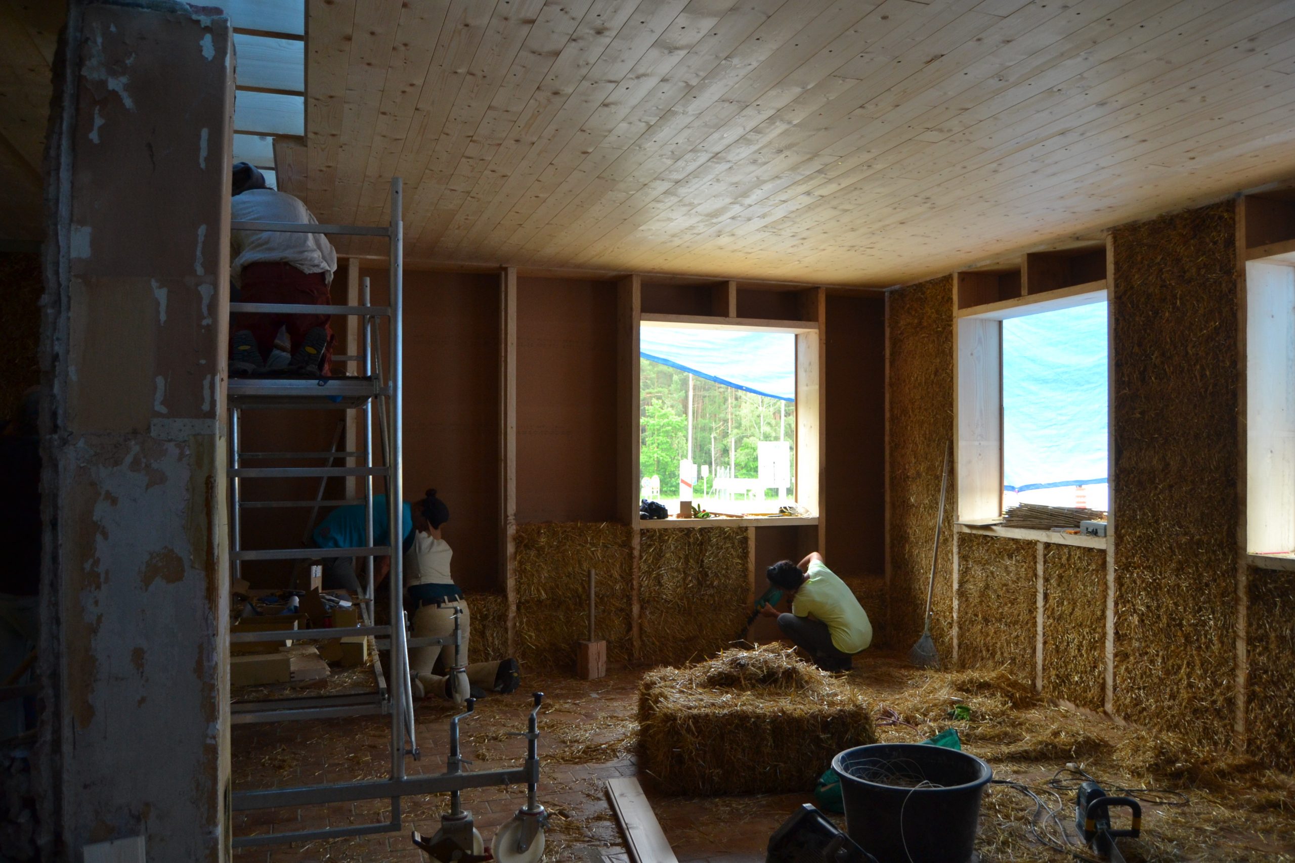 Doppelständerwand mit Stroh-Bodenplatte, Zwischendecke und Strohballen-Giebeldach