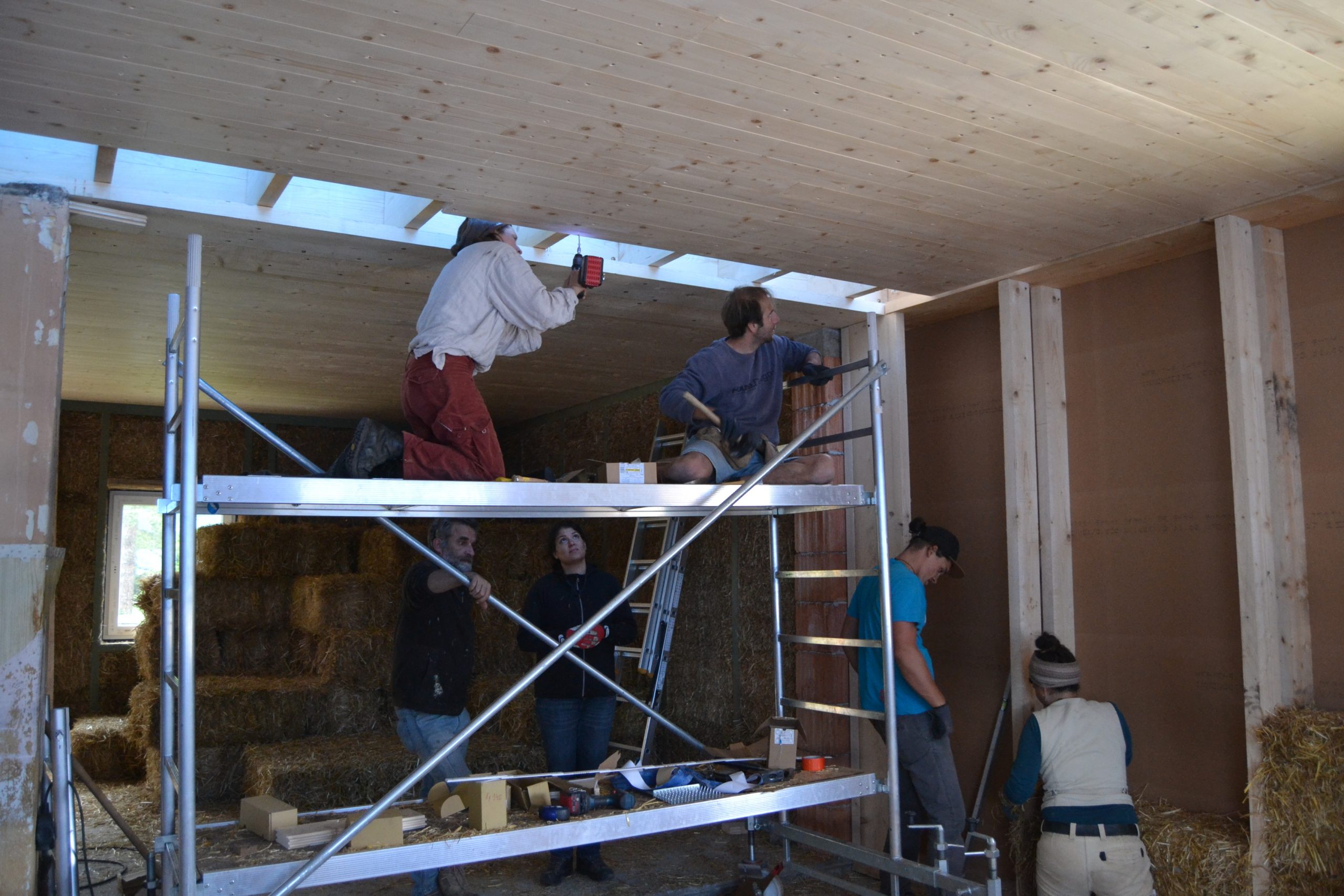 Doppelständerwand mit Stroh-Bodenplatte, Zwischendecke und Strohballen-Giebeldach