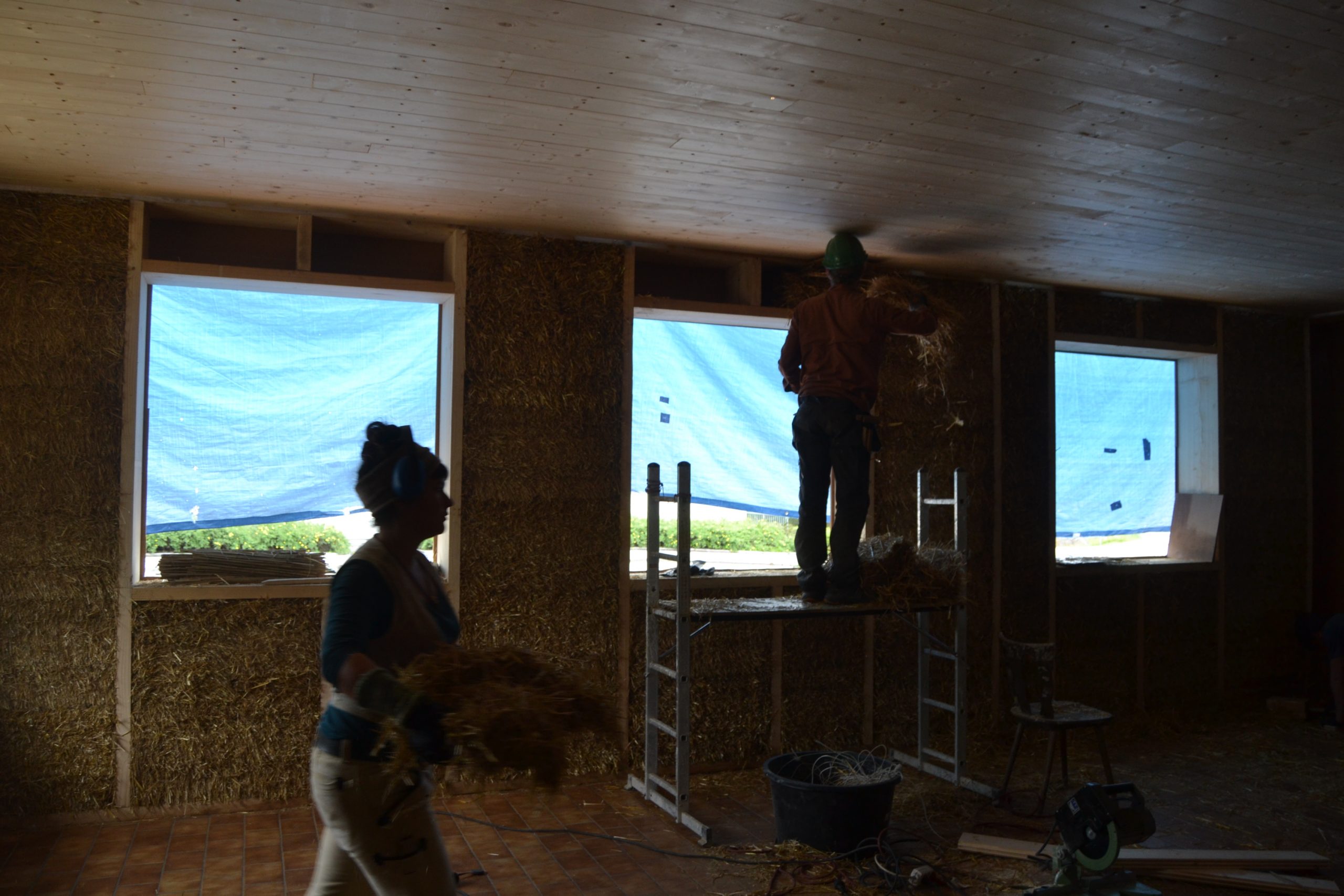 Doppelständerwand mit Stroh-Bodenplatte, Zwischendecke und Strohballen-Giebeldach