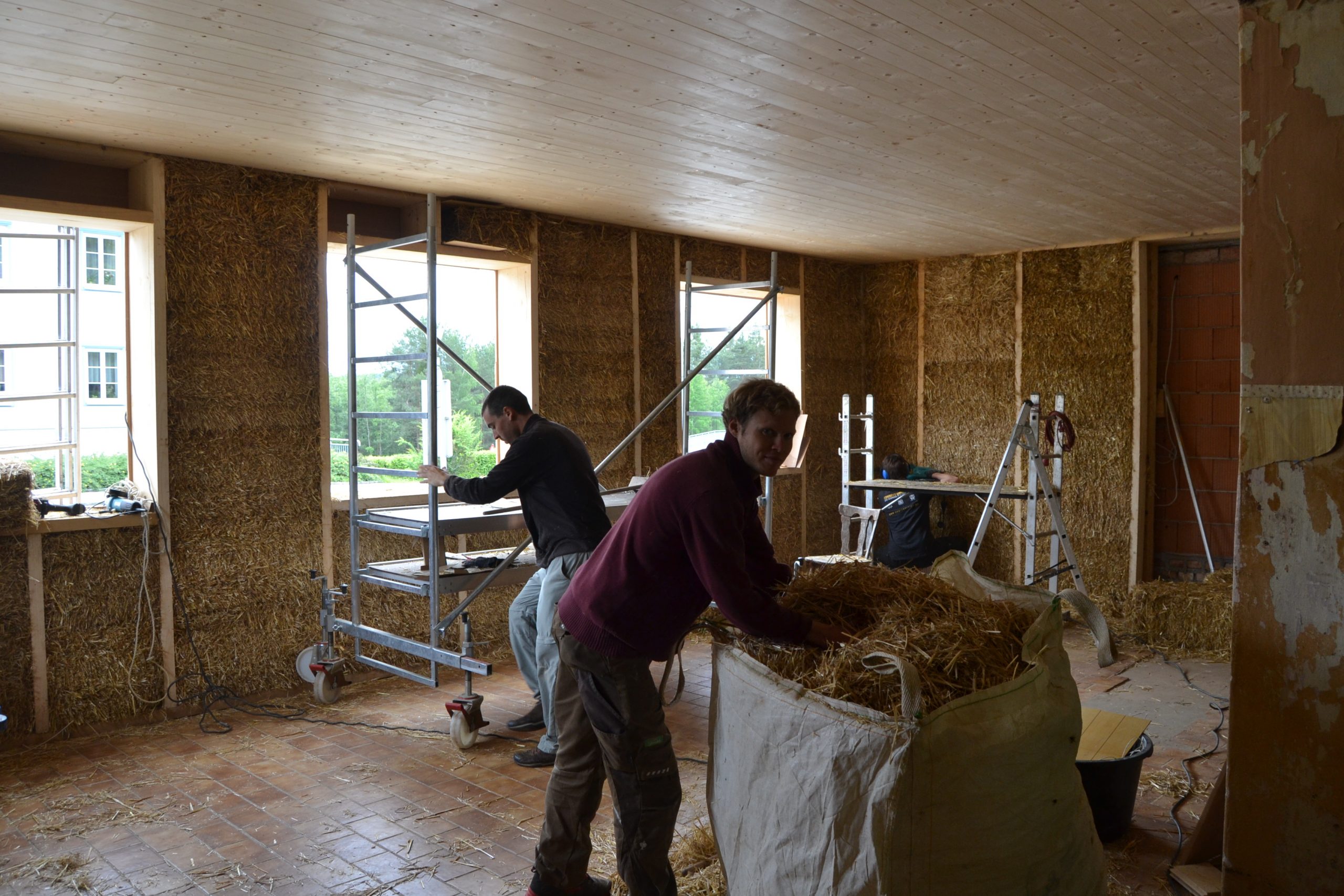 Doppelständerwand mit Stroh-Bodenplatte, Zwischendecke und Strohballen-Giebeldach