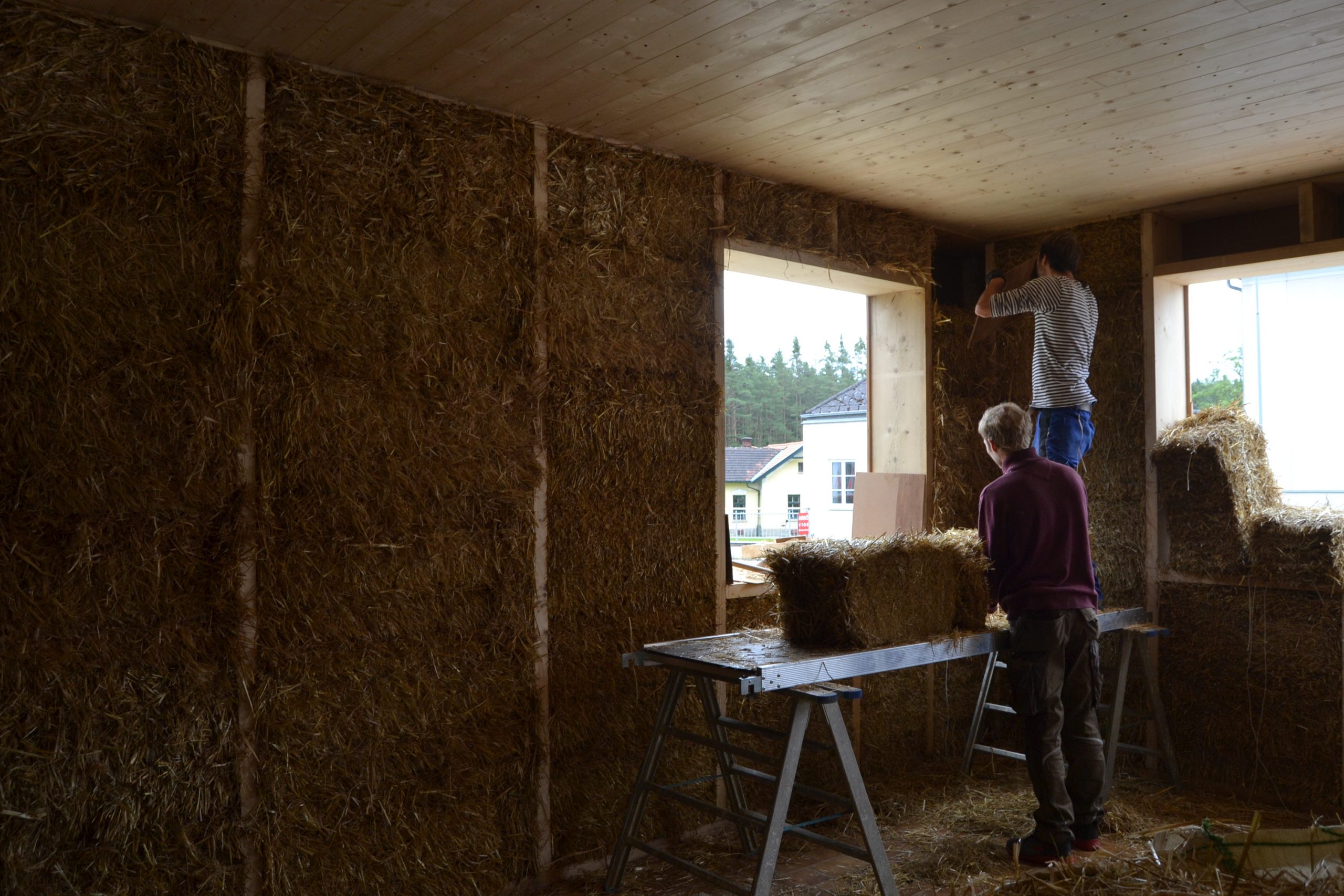 Doppelständerwand mit Stroh-Bodenplatte, Zwischendecke und Strohballen-Giebeldach